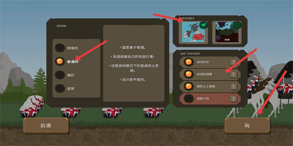 3、在難度選擇界面,選擇普通難度,設(shè)置游戲模式,點(diǎn)擊玩,進(jìn)入游戲地圖界面。