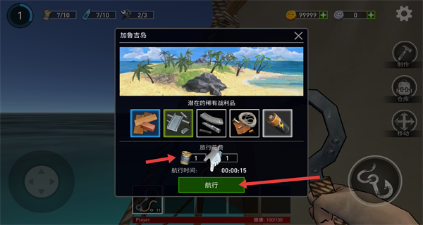 2、選擇加魯吉島查看航行所需物資及時(shí)間,即可點(diǎn)擊航行前往新島嶼,探索未知區(qū)域收集生存稀缺資源。