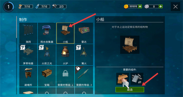 1、進(jìn)入制作界面選中小船,確認(rèn)木板金屬等材料充足后,點(diǎn)擊即可建造解鎖水上移動(dòng)工具拓展探索范圍。