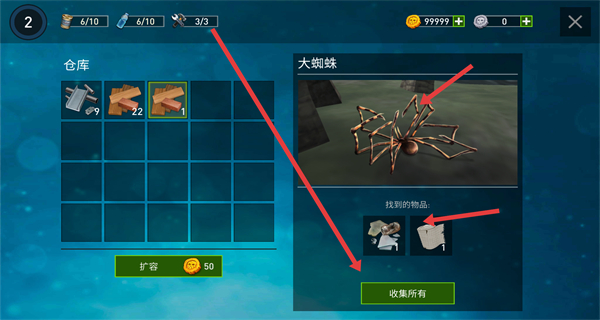 4、拾取后在倉庫界面發(fā)現(xiàn)大蜘蛛掉落物,點(diǎn)擊收集所有一鍵獲取物資,同時(shí)可消耗金幣擴(kuò)容倉庫規(guī)整資源方便后續(xù)使用。