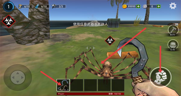 3、遭遇大蜘蛛敵人時(shí)切換武器如鉤子攻擊,遵循提示消滅敵人獲取掉落獎(jiǎng)勵(lì)提升戰(zhàn)斗經(jīng)驗(yàn)與生存能力。
