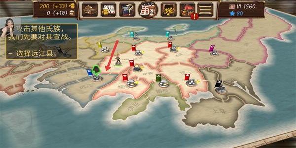 2、在領地地圖選擇遠江縣,查看該領地的基本信息,包括可掠奪金幣敵方守軍數量等,為后續(xù)行動做準備。