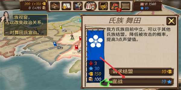 4、選擇對舞田氏族宣戰(zhàn),以此開啟與該氏族的戰(zhàn)爭,通過戰(zhàn)爭來拓展自己的幕府帝國勢力范圍。