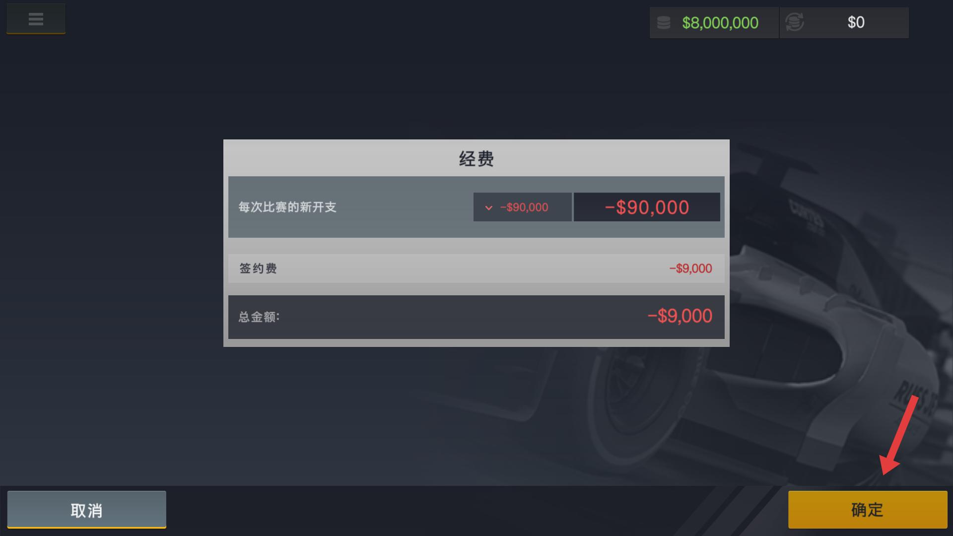 4、在經(jīng)費(fèi)界面,確認(rèn)比賽新開支與簽約費(fèi)等經(jīng)費(fèi)詳情后,點(diǎn)擊確定按鈕,可應(yīng)用經(jīng)費(fèi)設(shè)置,合理規(guī)劃車隊(duì)資金,保障賽事運(yùn)營(yíng)。