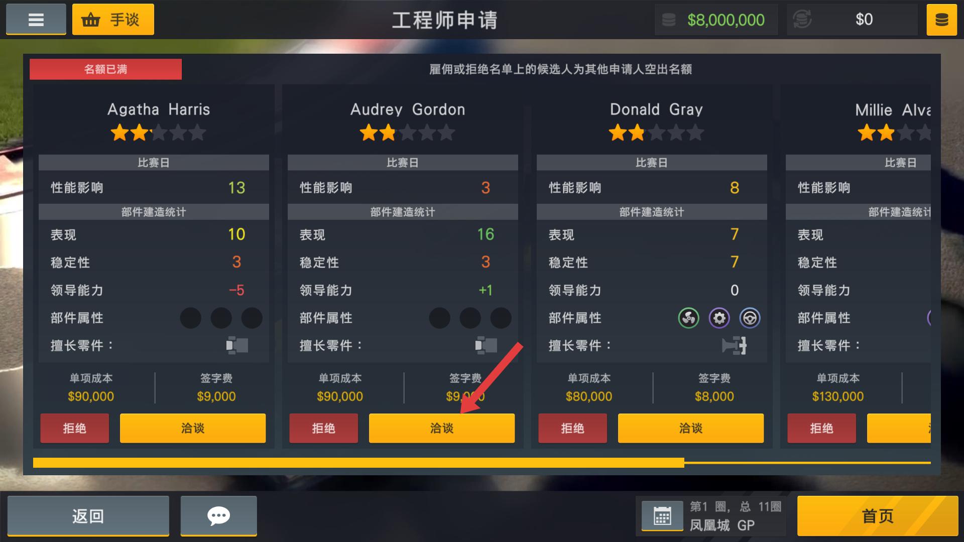 2、在工程師申請(qǐng)界面,點(diǎn)擊洽談按鈕,可與工程師候選人協(xié)商簽約事宜,爭(zhēng)取招募到性能出色的工程師,助力車隊(duì)部件研發(fā)與賽事表現(xiàn)。