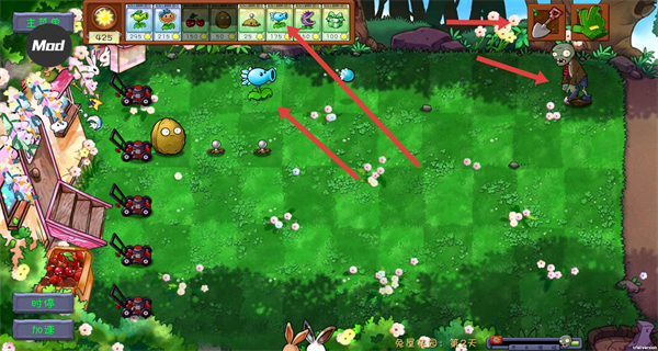 4、戰(zhàn)斗時(shí)優(yōu)先在草坪種植寒冰射手攻擊僵尸,搭配堅(jiān)果墻抵御利用頂部植物欄選種,快速消滅右側(cè)逼近的敵人守護(hù)陣地。