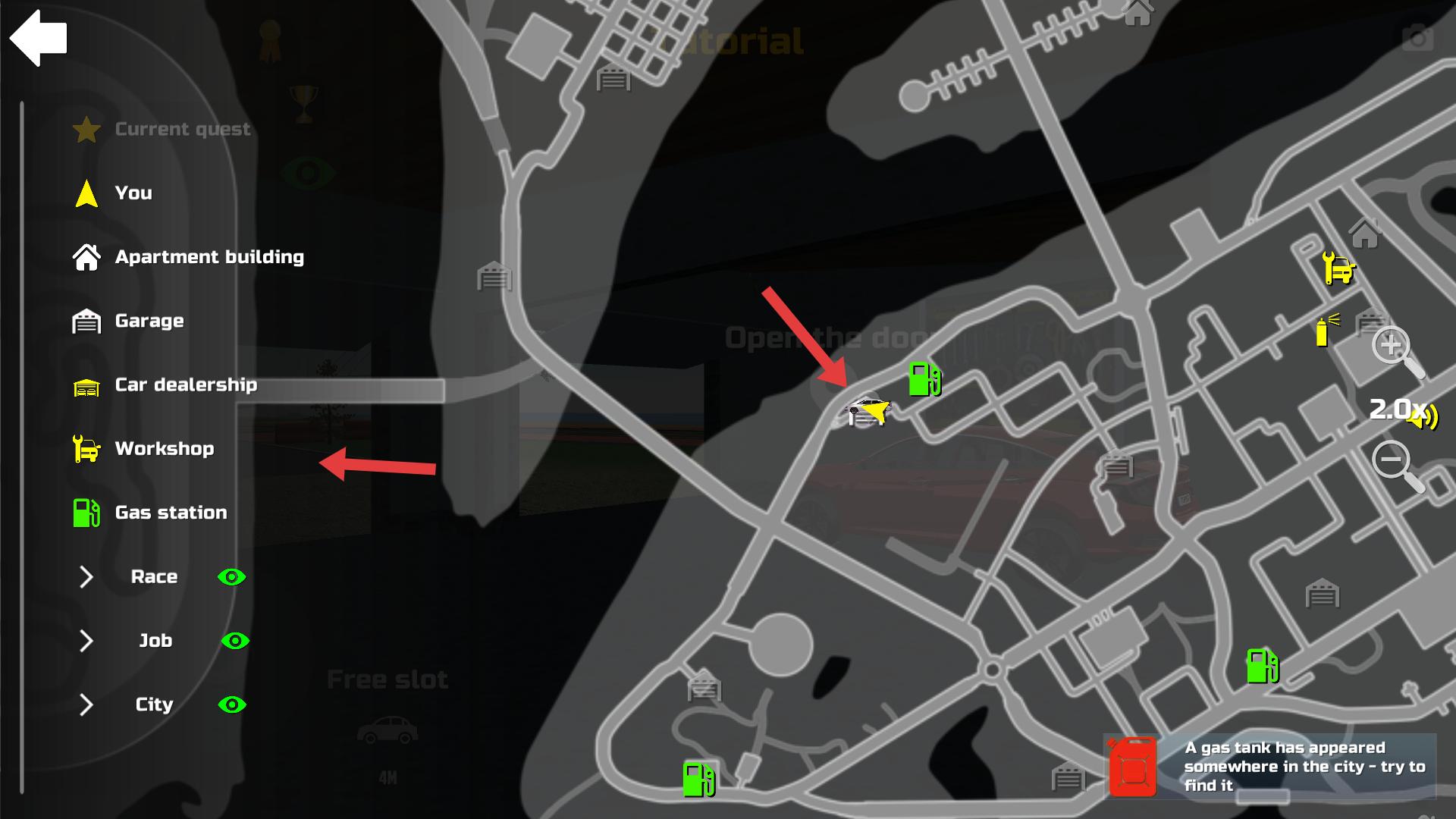 4、在地圖界面,可查看當(dāng)前位置,任務(wù)點(diǎn)及各類(lèi)地點(diǎn)如車(chē)庫(kù),加油站等,根據(jù)地圖指引完成找油箱等任務(wù)。
