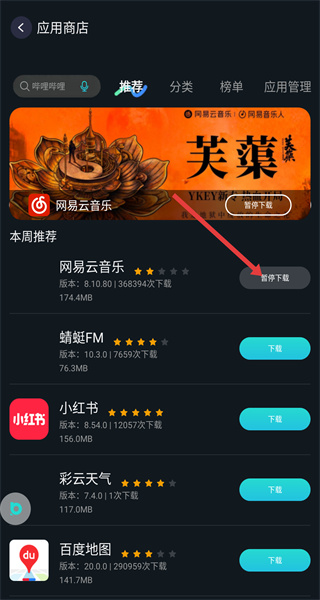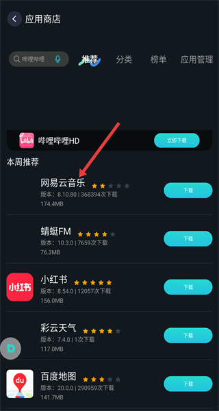 1、打開應(yīng)用商店,進(jìn)入應(yīng)用推薦界面,瀏覽本周推薦的各類應(yīng)用,尋找感興趣的應(yīng)用。