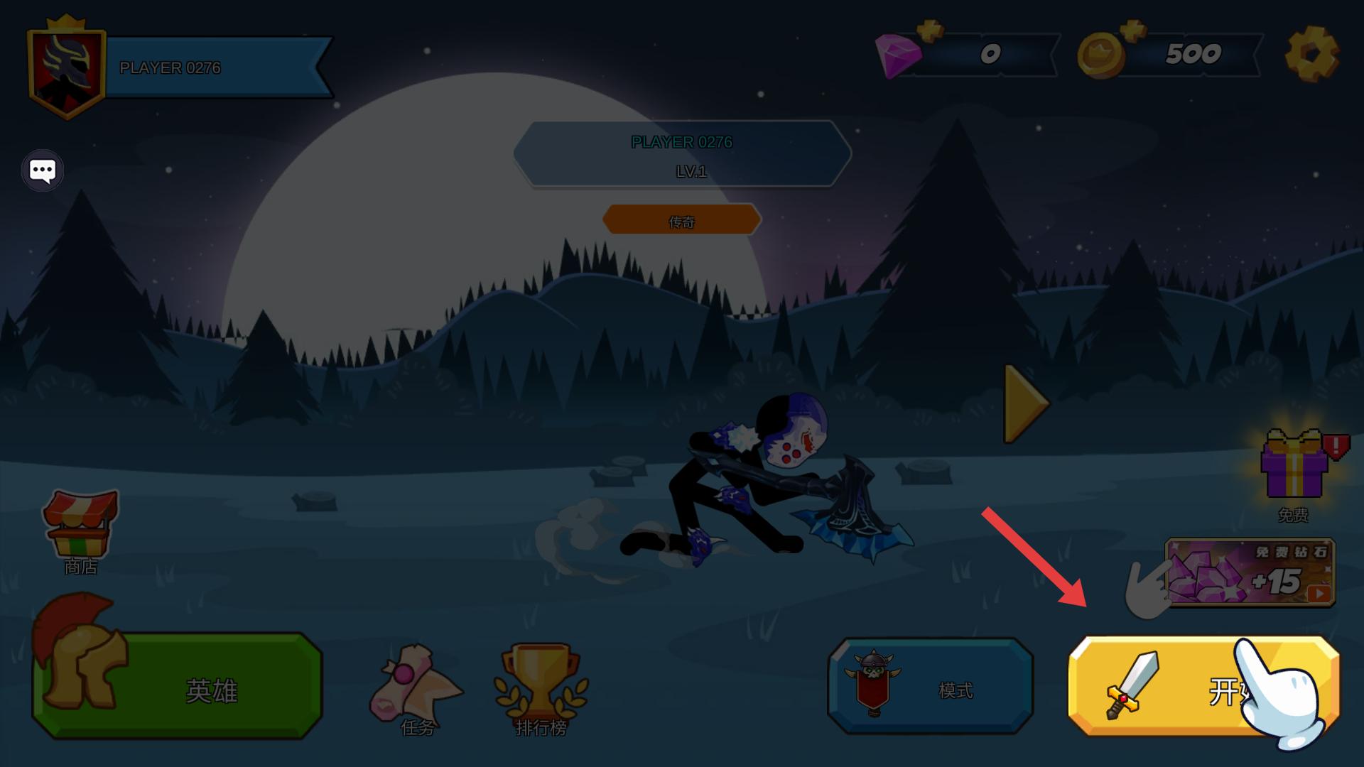 1、進(jìn)入游戲看到帶有火柴人角色的主界面,有商店,英雄,任務(wù)等板塊,點(diǎn)擊開始按鈕可進(jìn)入戰(zhàn)斗。