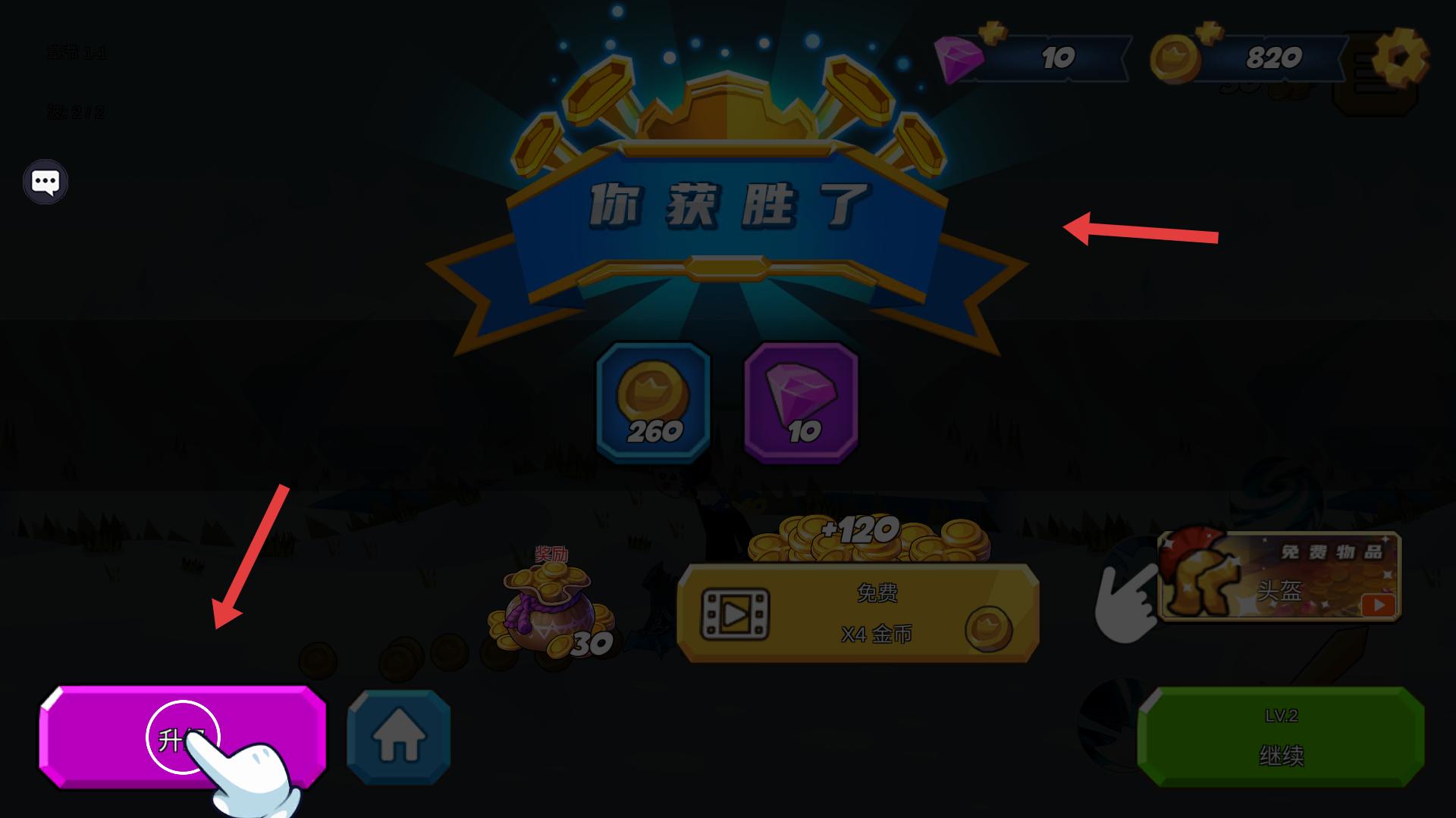 3、戰(zhàn)斗勝利后出現(xiàn)你獲勝了界面,可獲得金幣,鉆石獎(jiǎng)勵(lì),點(diǎn)擊升級(jí)按鈕提升英雄能力。