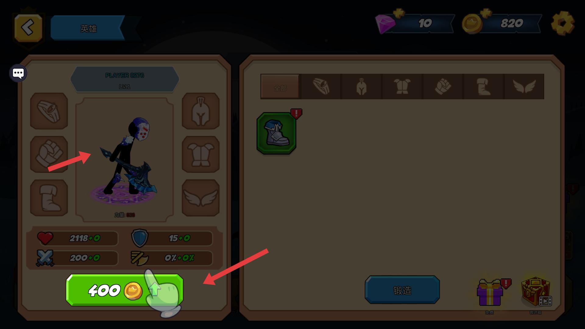 4、在英雄界面可查看角色屬性,消耗金幣升級(jí)英雄,還能鍛造裝備,提升戰(zhàn)力以便更好戰(zhàn)斗。