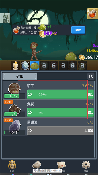 4、在礦山界面中升級礦工、煤炭、黑曜石等資源點,提升資源產(chǎn)出速度,獲取金幣和經(jīng)驗,為角色成長和探險提供資源支持。