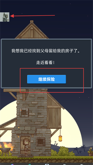 1、點擊繼續(xù)探險按鈕操控角色在不同場景中探索,推進(jìn)劇情,尋找父母留下的房子,解鎖新的游戲區(qū)域和內(nèi)容。