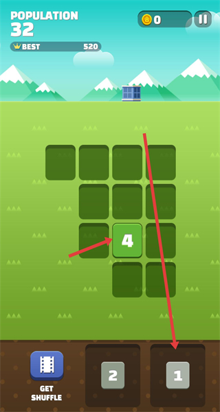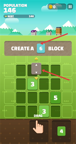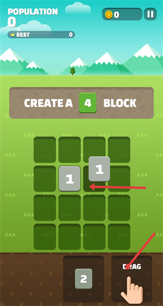 4、游戲初始拖動(dòng)底部數(shù)字塊至網(wǎng)格,同數(shù)相鄰自動(dòng)合并,逐步合成更大數(shù)字提升Population,拓展網(wǎng)格建筑積累分?jǐn)?shù)沖擊最佳紀(jì)錄。