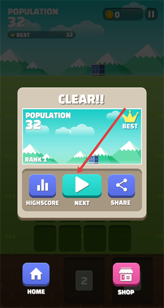 2、勝利通關(guān)后結(jié)算頁展示Population與Best,點(diǎn)擊NEXT進(jìn)入下一關(guān)繼續(xù)挑戰(zhàn)突破紀(jì)錄解鎖復(fù)雜合并玩法。