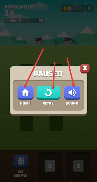 2、游戲點(diǎn)擊暫停鍵呼出菜單HOME返回主界面RETRY重玩本關(guān)和SOUND調(diào)節(jié)音量,靈活運(yùn)用暫停功能調(diào)控游戲。