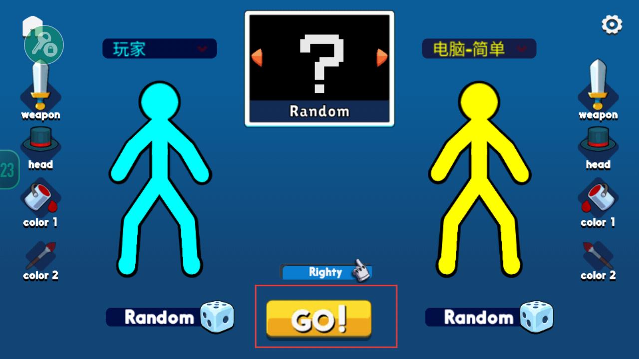 1、游戲可選擇玩家與電腦簡單模式對戰(zhàn),還能自定義武器、頭部、顏色等,設置好后點擊GO即可開啟火柴人格斗。