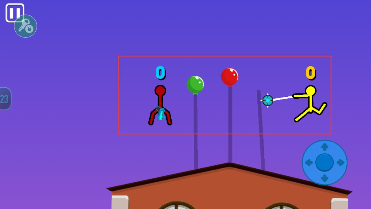 2、戰(zhàn)斗中火柴人使用武器攻擊,場景中有氣球等元素,需在平臺上與敵方火柴人展開對抗,爭奪戰(zhàn)斗優(yōu)勢。