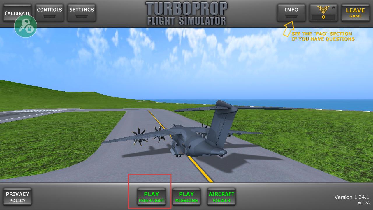 1、游戲主界面有PLAY FREE-FLIGHT、PLAY MISSIONS等模式,選擇后可駕駛渦輪螺旋槳飛機(jī)開啟飛行體驗(yàn)。