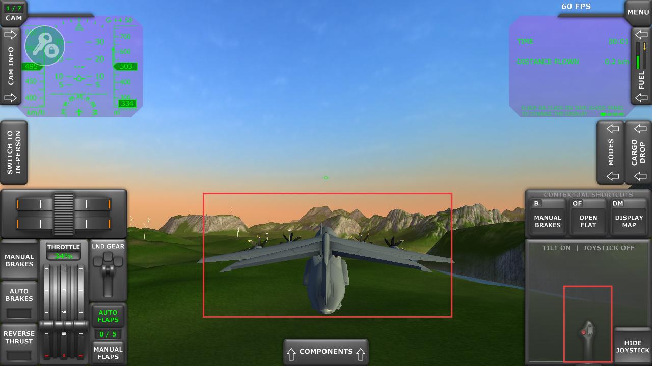 2、飛行時(shí)通過右側(cè)操縱桿控制飛機(jī)姿態(tài),觀察儀表盤數(shù)據(jù),在包含山脈等景觀的空域中飛行。