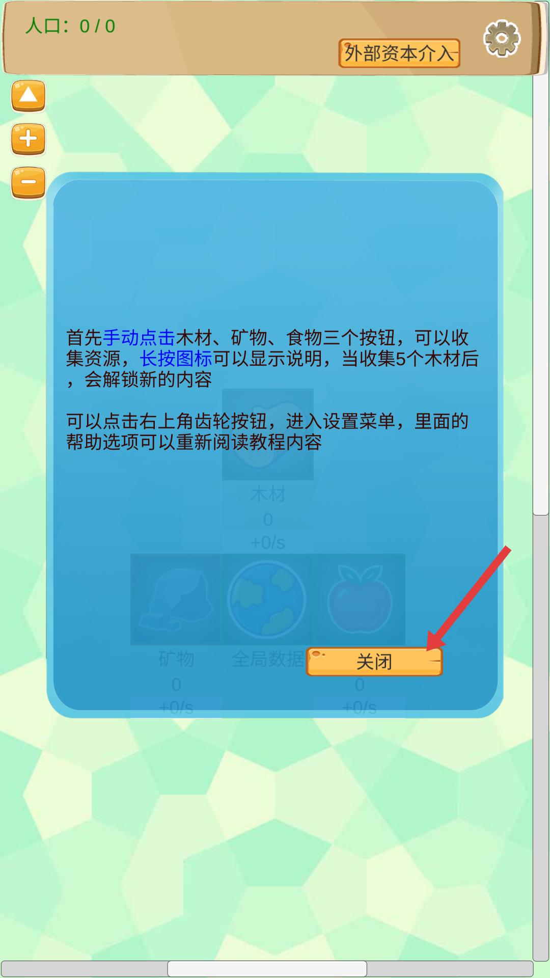 2、游戲開始時會有教程提示,點擊右上角齒輪按鈕可進入設(shè)置菜單重新閱讀教程,閱讀后點擊【關(guān)閉】繼續(xù)游戲。