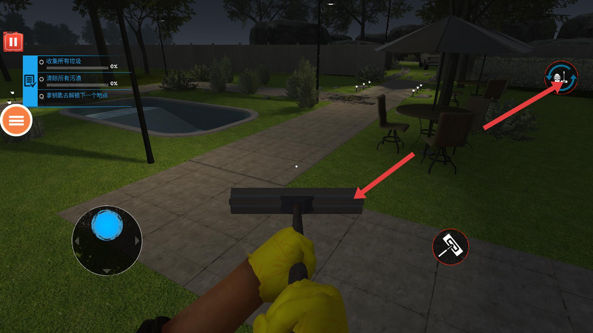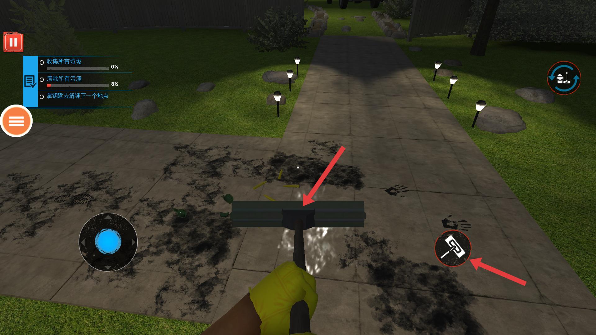 3、點擊右側(cè)工具切換按鈕,可切換清潔工具,如拖把,使用拖把可清理地面污漬,需根據(jù)污漬類型選擇合適工具,有效推進清除污漬的任務(wù)。