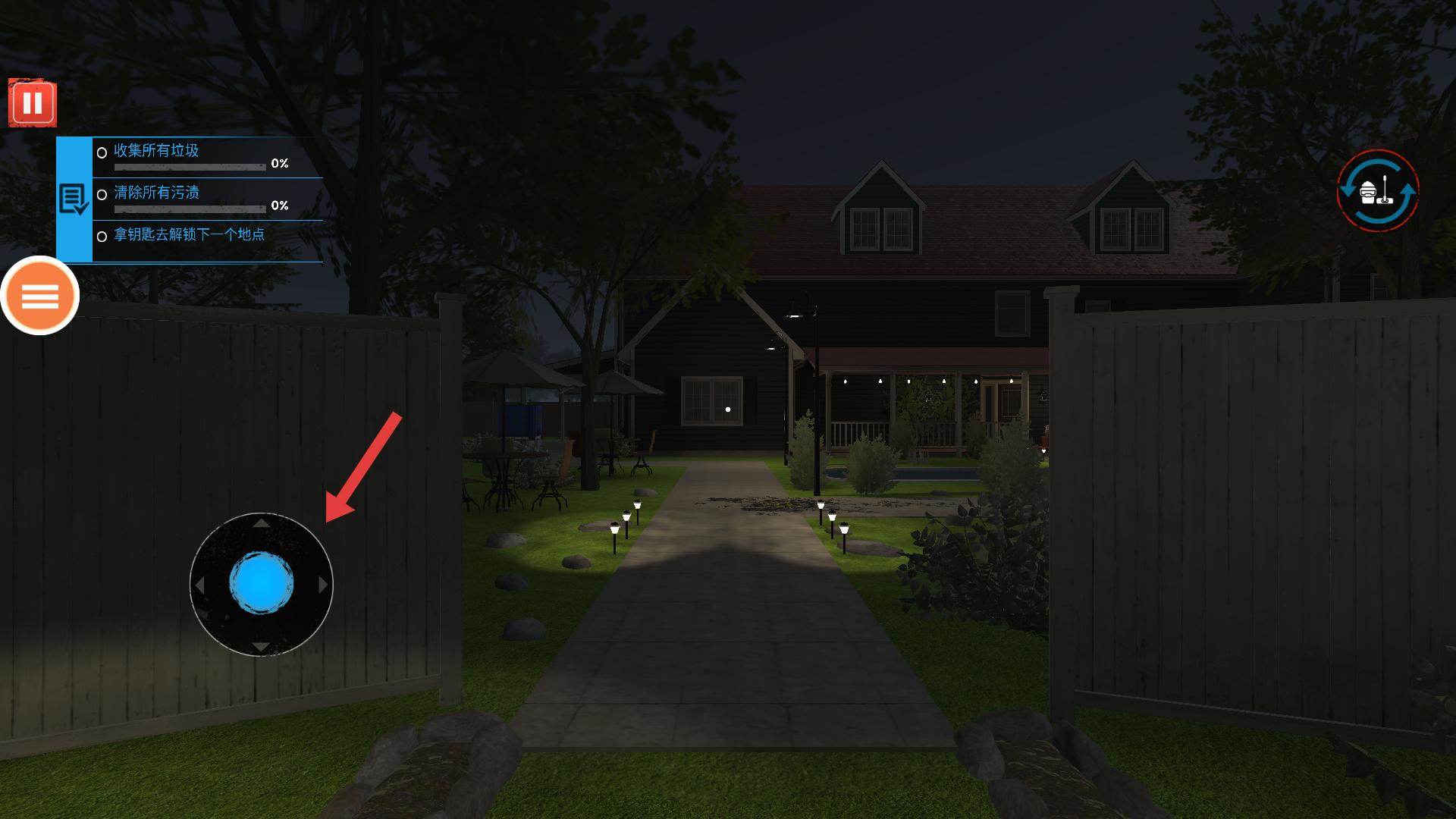 2、進入游戲后,使用左側(cè)方向鍵控制角色移動,在場景中探索,左側(cè)任務(wù)欄顯示收集垃圾、清除污漬、拿鑰匙解鎖下一個地點的任務(wù),需按任務(wù)推進游戲。