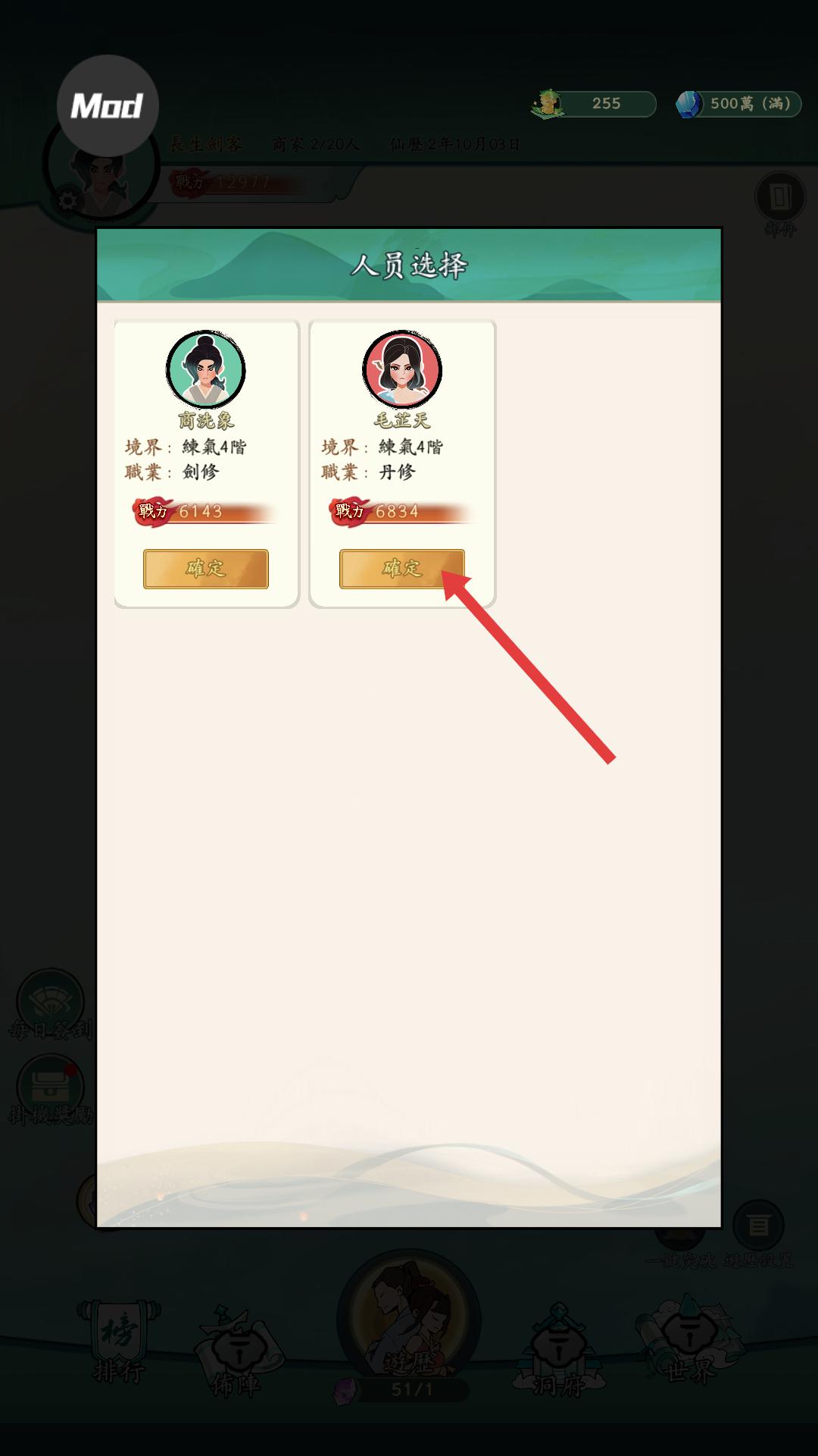 3、在人員選擇界面,可查看不同角色的境界、職業(yè)和戰(zhàn)力,選擇戰(zhàn)力較高的角色如毛逆天,點(diǎn)擊確定按鈕,即可指定該角色進(jìn)行游歷。