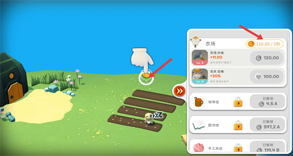 3、進(jìn)入農(nóng)場(chǎng)界面點(diǎn)擊右側(cè)面板的金幣按鈕,點(diǎn)擊提升農(nóng)場(chǎng)等級(jí)增加產(chǎn)出效率解鎖更多經(jīng)營(yíng)選項(xiàng),收集更多金幣讓之后的升級(jí)更快。