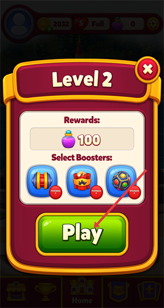 1、進入Level2點擊Play開啟挑戰(zhàn)可按需選Boosters,目標完成關(guān)卡贏100藥水獎勵快速熟悉規(guī)則推進冒險。