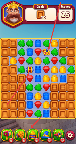 3、善用下方技能與關(guān)卡特殊元素觸發(fā)特效擴消除范圍,快速清箱子減步數(shù)消耗,助力25步內(nèi)完成40個箱子的目標。