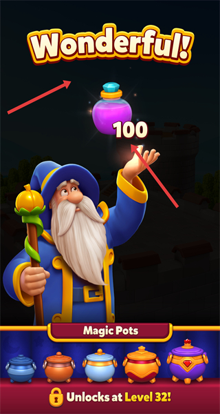 4、通關(guān)后獲100藥水積累可解鎖Level32的MagicPots系統(tǒng),持續(xù)闖關(guān)攢進度解鎖更多魔法鍋玩法拓展游戲內(nèi)容。
