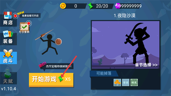 1、點(diǎn)擊開始游戲進(jìn)入夜隱沙漠章節(jié)開始火柴人戰(zhàn)斗之旅,可關(guān)注商店裝備等系統(tǒng)為戰(zhàn)斗做準(zhǔn)備。