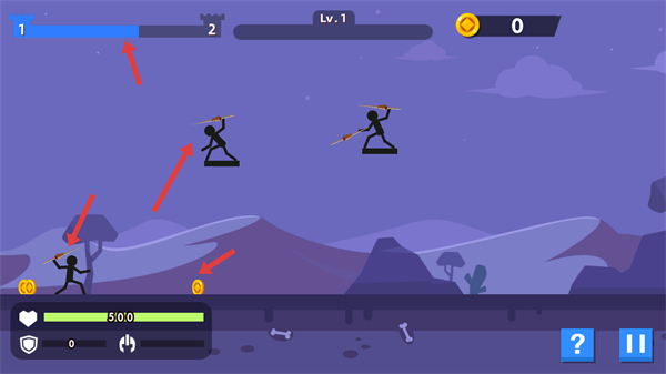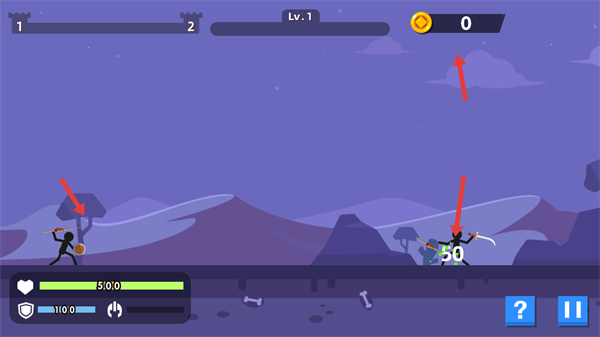 3、操控火柴人攻擊敵人留意傷害數(shù)值和金幣獲取,保持生命值逐步推進(jìn)關(guān)卡積累戰(zhàn)斗經(jīng)驗(yàn)和資源。