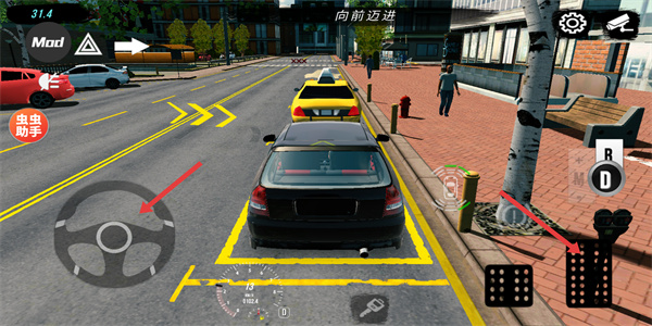 3、在停車關(guān)卡,通過(guò)操作方向盤控制方向,踩踏踏板控制車輛前進(jìn)后退,將車停入指定位置。