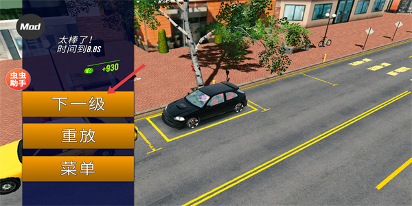4、成功停車后,點(diǎn)擊下一級(jí),繼續(xù)挑戰(zhàn)更高難度的停車關(guān)卡,不斷提升停車技巧。