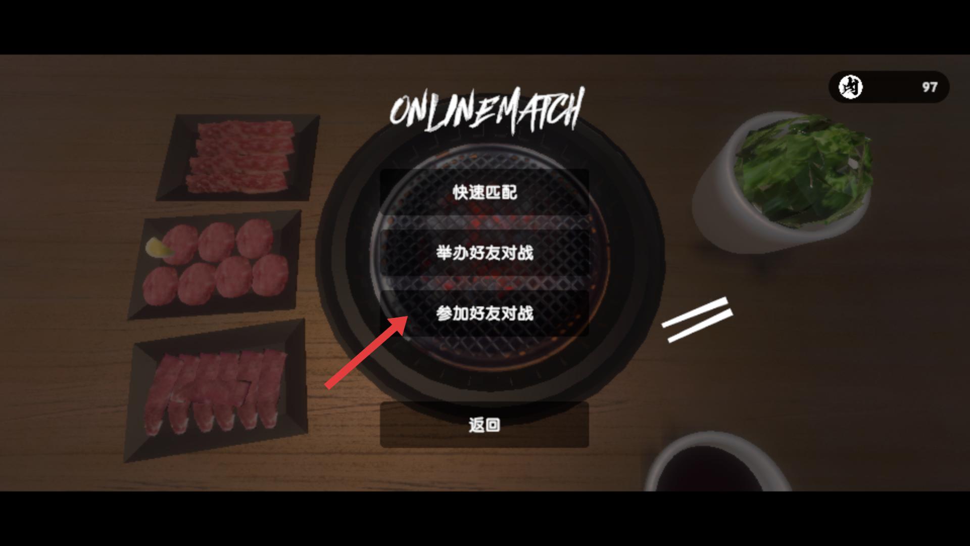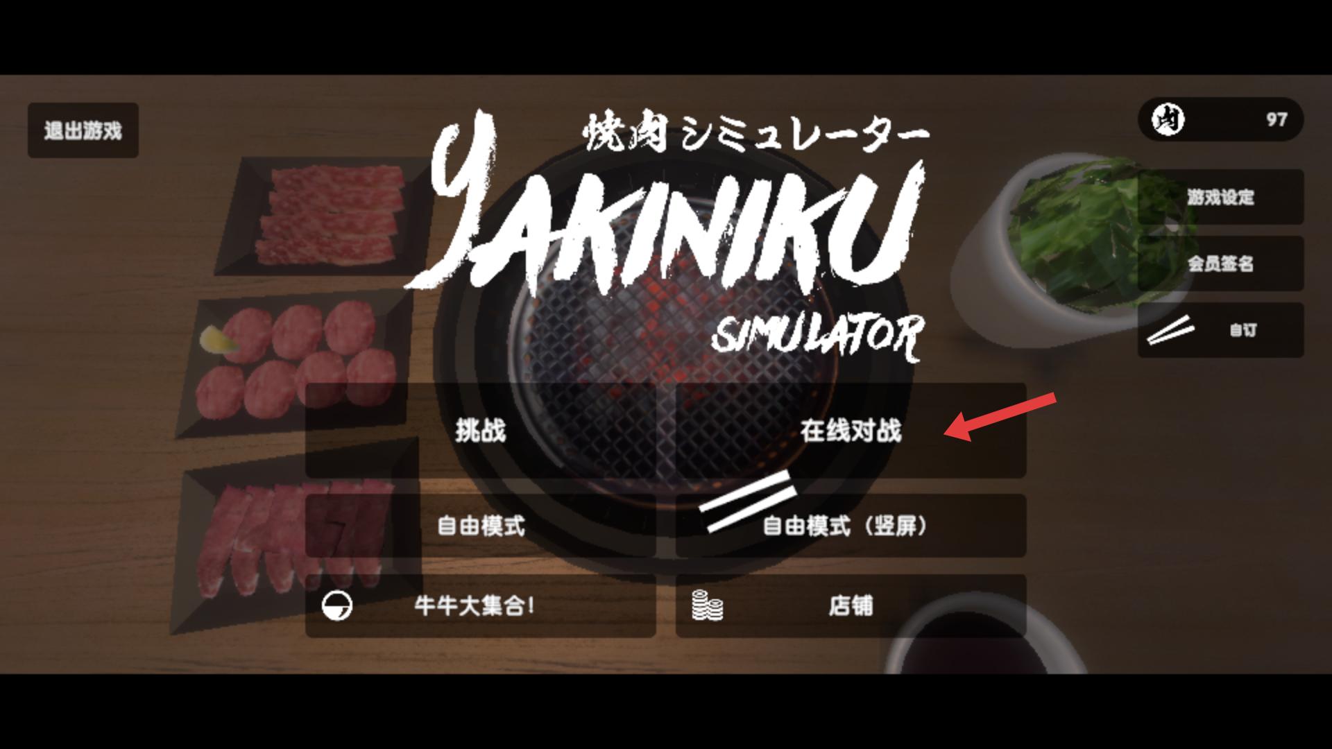 1、在游戲主界面選擇在線對戰(zhàn)模式,可與其他玩家在線比拼烤肉技巧,還有挑戰(zhàn)、自由模式等,需根據(jù)喜好選擇。