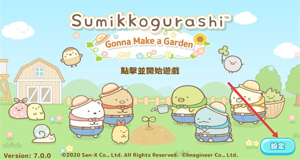 1、進(jìn)入Sumikkogurashi Gonna Make a Garden主頁面,點(diǎn)擊右下角設(shè)定按鈕,打開設(shè)置界面可調(diào)整游戲各項(xiàng)參數(shù)。