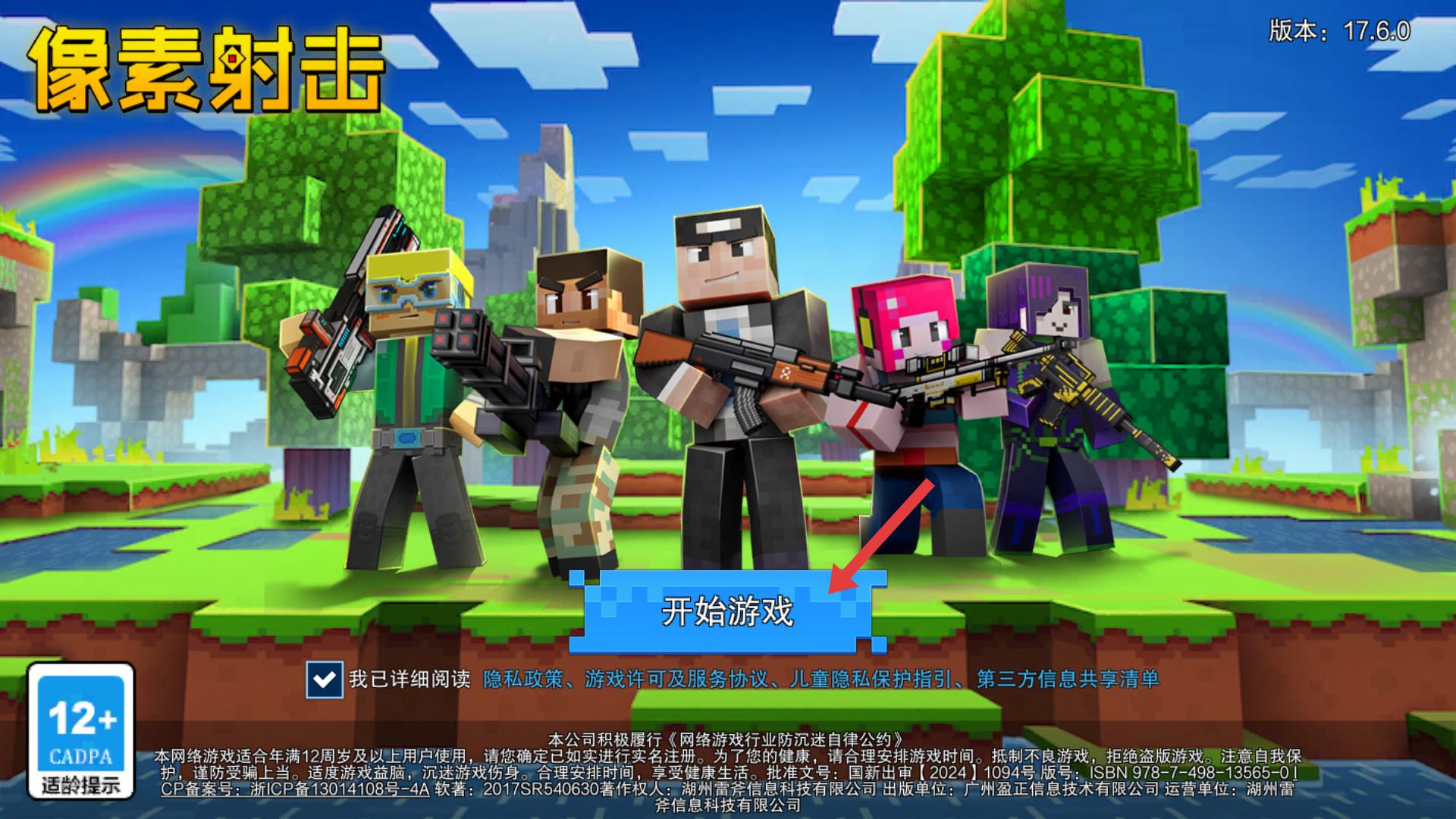 1、在游戲啟動界面點(diǎn)擊開始游戲,進(jìn)入游戲主界面,需先閱讀并同意隱私政策等協(xié)議,方可開啟像素射擊的游戲之旅。