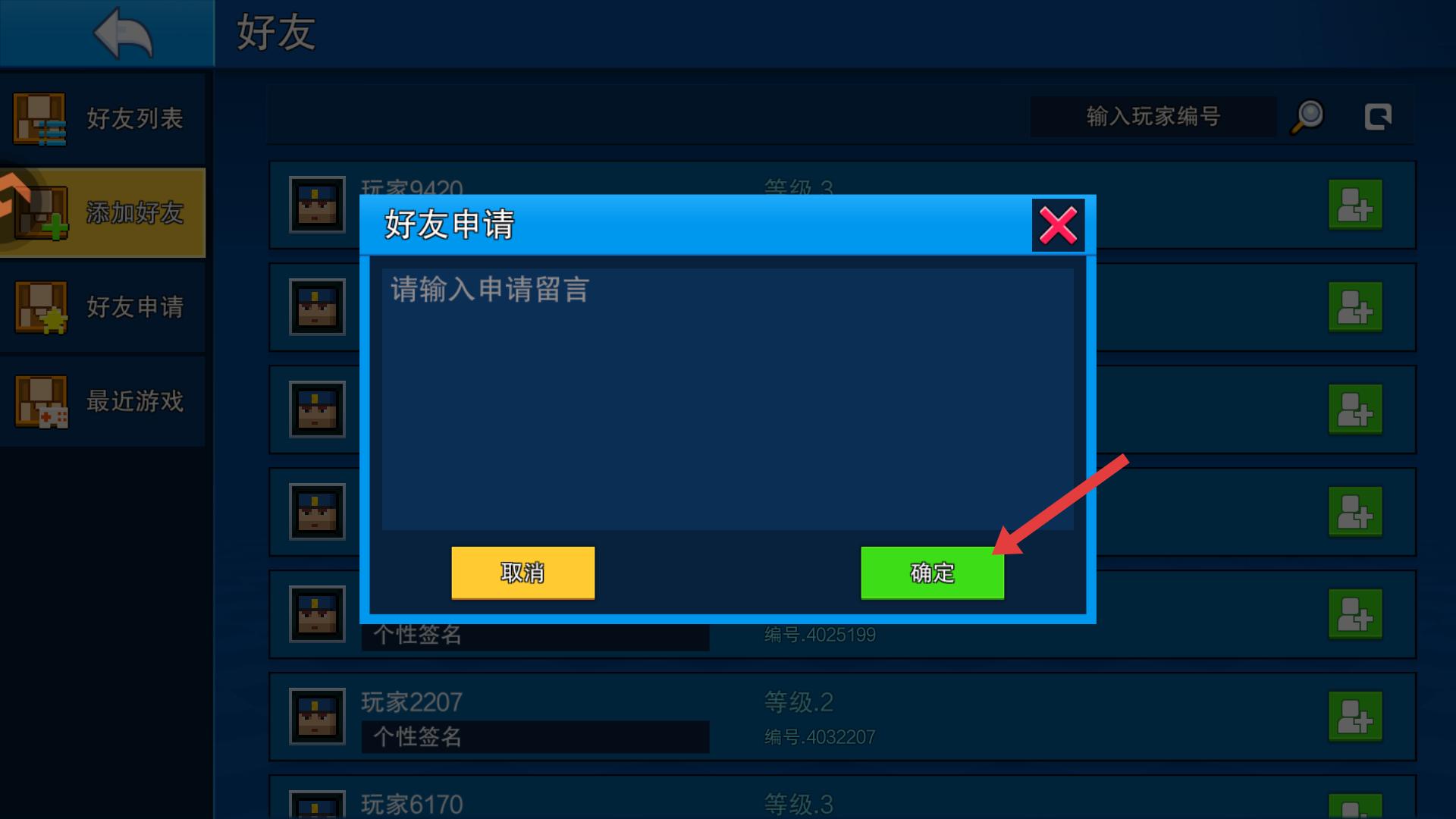4、發(fā)送好友申請時,可輸入申請留言,然后點(diǎn)擊確定按鈕發(fā)送申請,等待對方通過后即可成為好友,一起參與游戲?qū)?zhàn)。