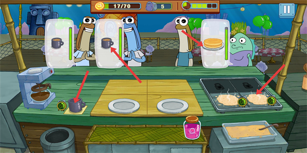 1、點(diǎn)擊進(jìn)行游戲進(jìn)入蟹堡王經(jīng)營(yíng)場(chǎng)景,開(kāi)啟海綿寶寶的餐品制作與經(jīng)營(yíng)之旅。