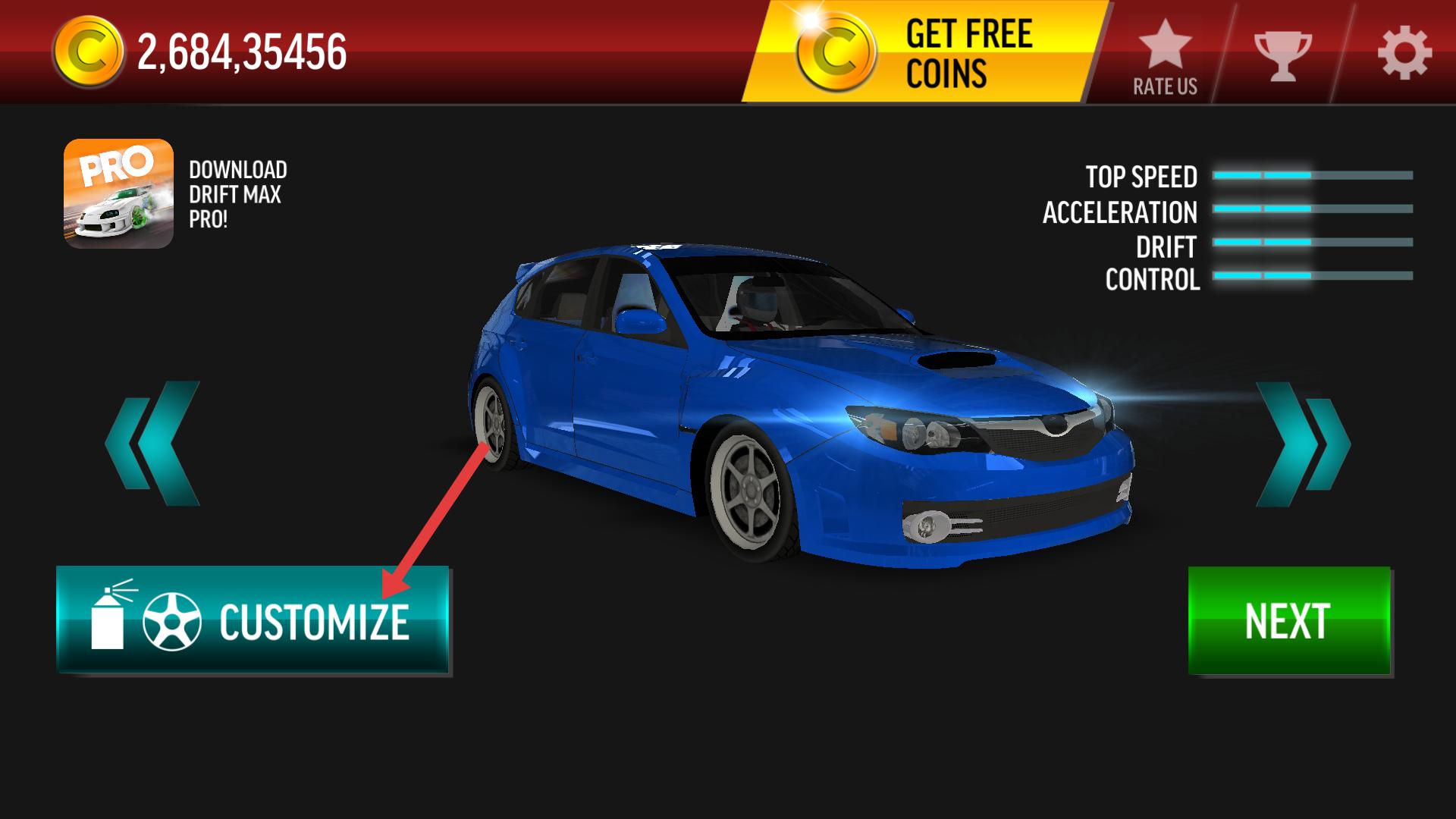 1、在車輛界面點擊CUSTOMIZE按鈕,可進入車輛自定義界面,界面可對車輛外觀進行改裝,需根據喜好選擇改裝項目提升車輛顏值。