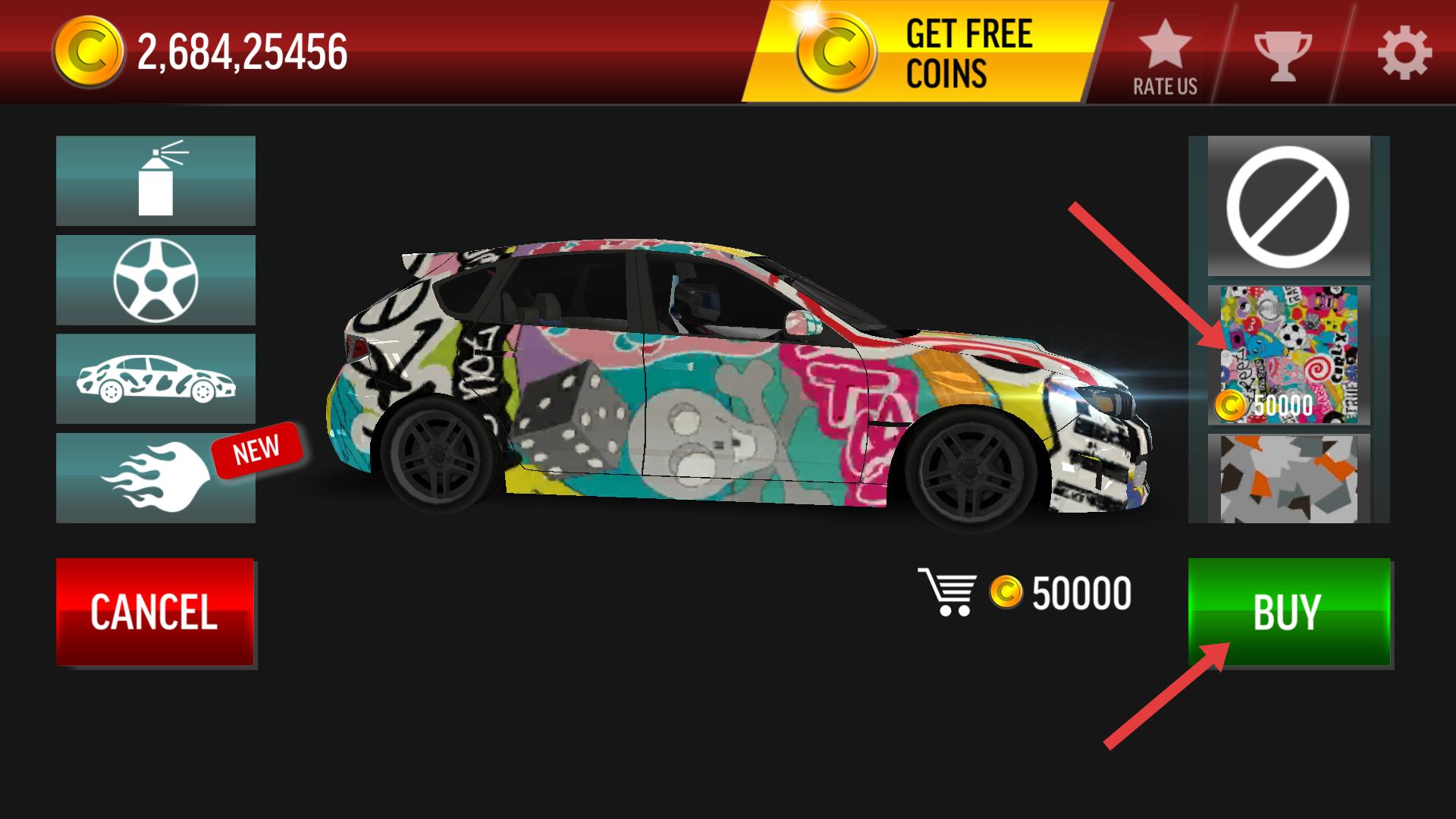 4、還可選擇車身涂裝改裝,花費50000金幣購買彩色涂鴉涂裝,點擊BUY按鈕安裝,豐富車輛外觀風格,打造專屬漂移座駕。