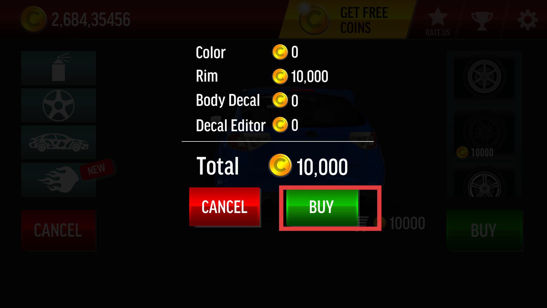 3、在輪轂購買確認界面,核對花費金幣數量,點擊BUY按鈕完成購買,購買后輪轂自動安裝到車輛上,讓車輛外觀更具特色。