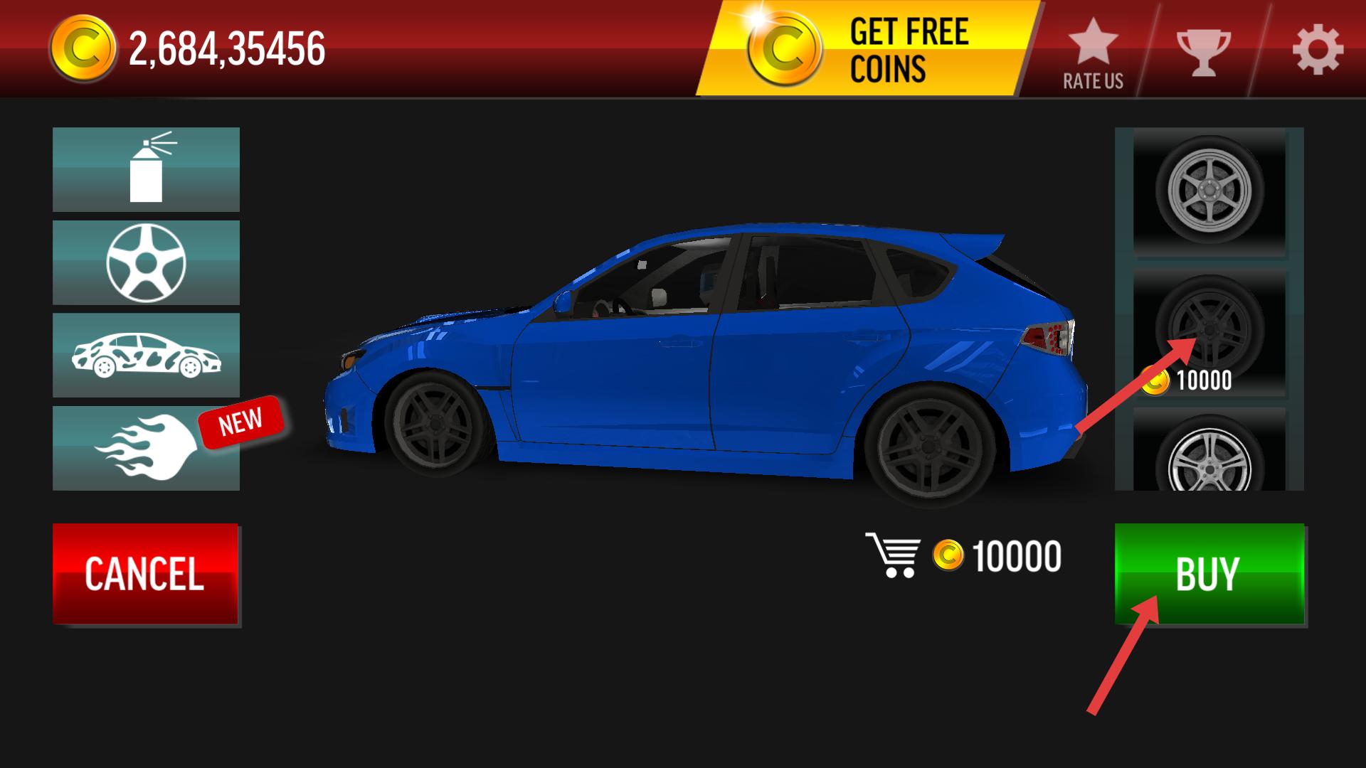2、進入自定義界面后,選擇輪轂改裝項目,花費10000金幣可購買新輪轂,點擊BUY按鈕即可安裝,提升車輛外觀個性度。