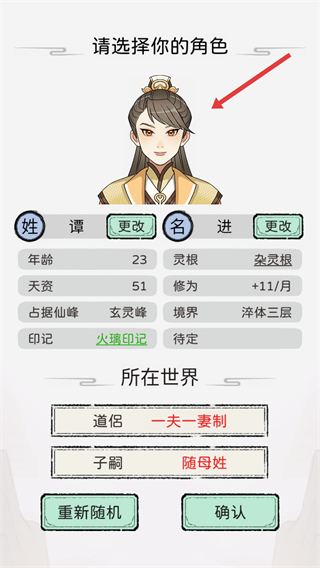 1、選擇角色時(shí)查看姓名、靈根、天資等屬性根據(jù)喜好確認(rèn)角色,進(jìn)入修仙世界開啟家族發(fā)展之旅。