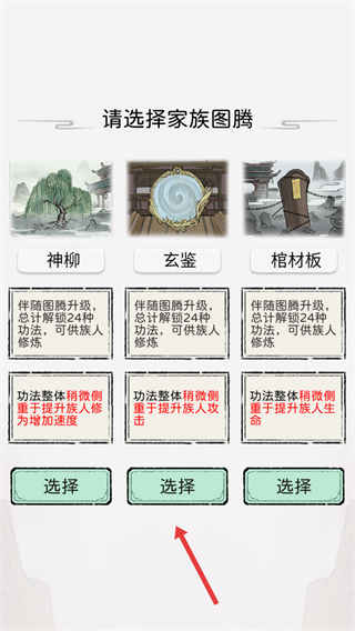 2、選擇家族圖騰如神柳、玄鑒、棺材板不同圖騰側(cè)重提升修為、攻擊、生命根據(jù)家族發(fā)展方向選擇解鎖功法供族人修煉。