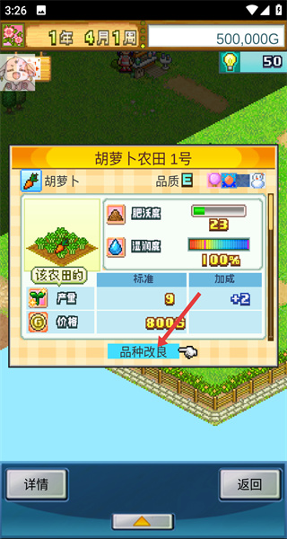 2、玩家在農(nóng)田界面,找到品種改良選項(xiàng)并點(diǎn)擊,著手對(duì)農(nóng)作物品種進(jìn)行優(yōu)化。