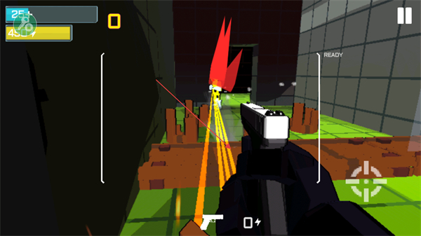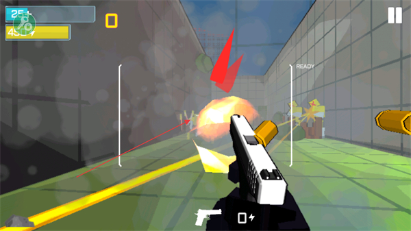 3、利用槍械瞄準(zhǔn)并射擊敵人,精準(zhǔn)打擊不同類型的敵人如紅色尖刺狀敵人,消滅敵人以獲取分?jǐn)?shù)和資源。