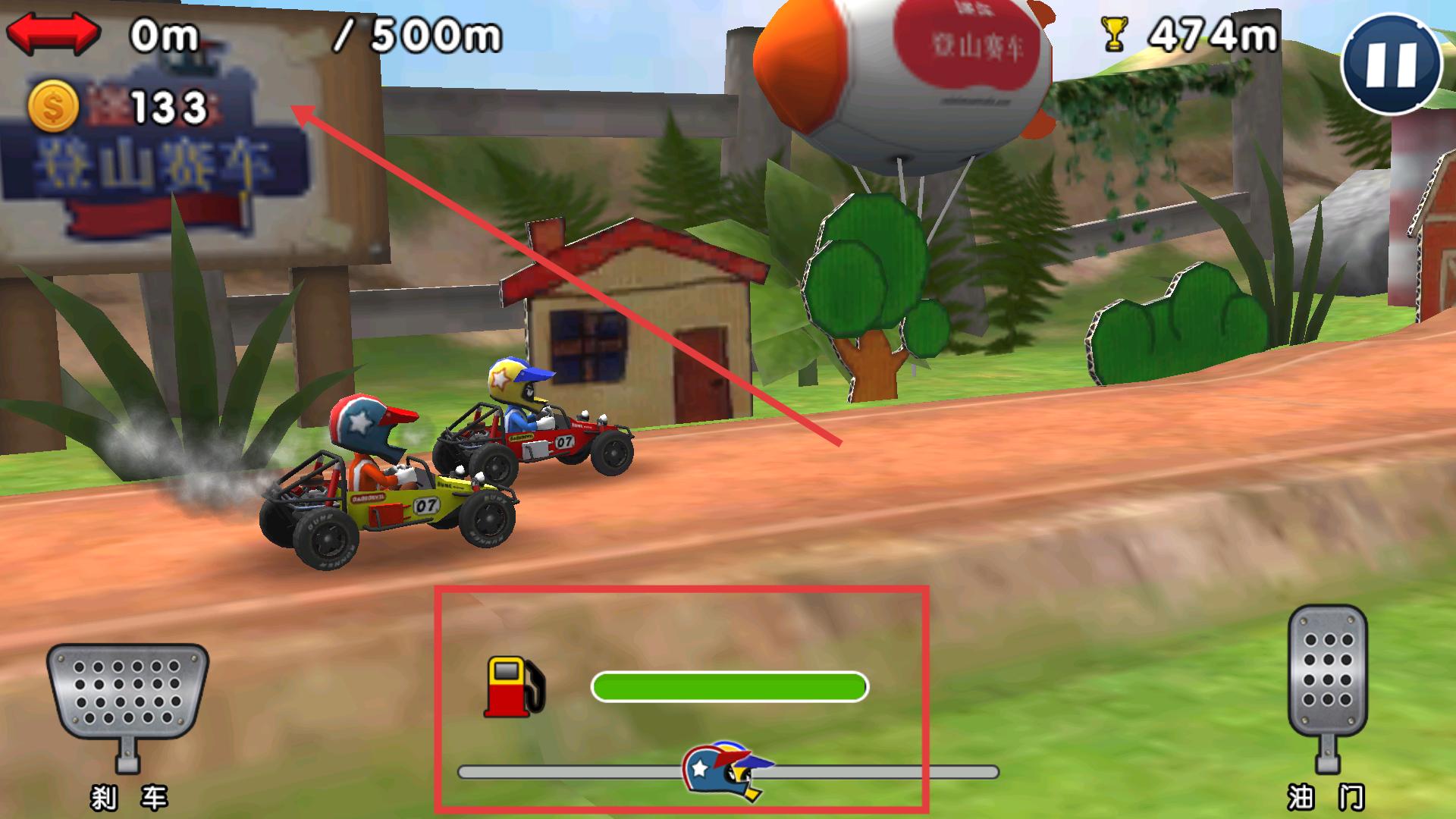 1、進(jìn)入迷你登山賽車游戲,關(guān)注金幣數(shù)量和行駛距離,通過控制油門和剎車,在崎嶇賽道上行駛收集金幣,積累資源。